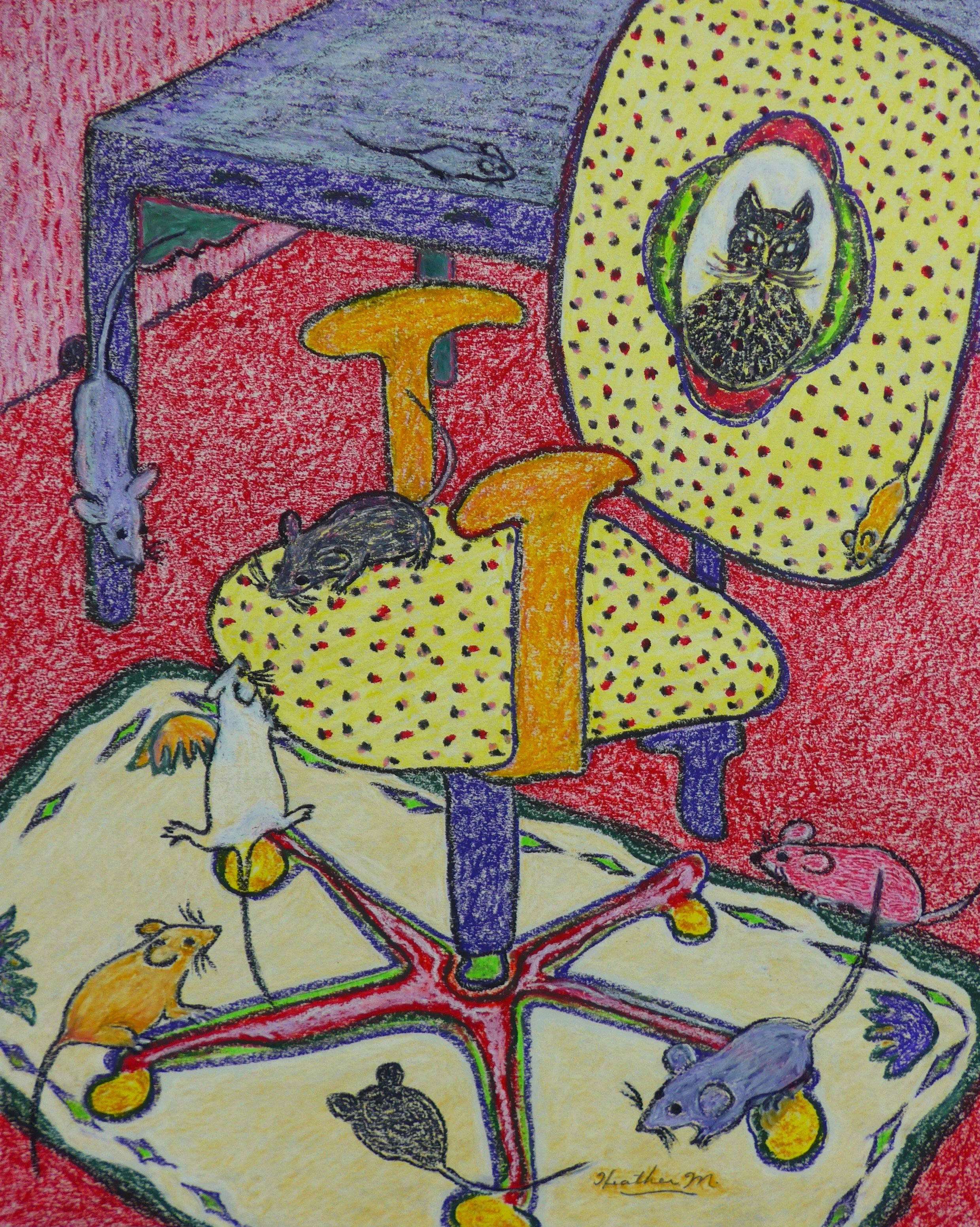 One of my favorites is called “A Quiet Moment”. It is a small colored marker drawing of an interior scene. I spent some time in a vacation rental property near here while some house renovations were being done. I used one of the living room chairs as a starting point and then added a woman sitting comfortably. Beside her is a small table with a cup of tea and a potted daffodil. Behind her I added some photographs on the wall and a window displaying a collection of vases. It shows a moment of peace and reflection.